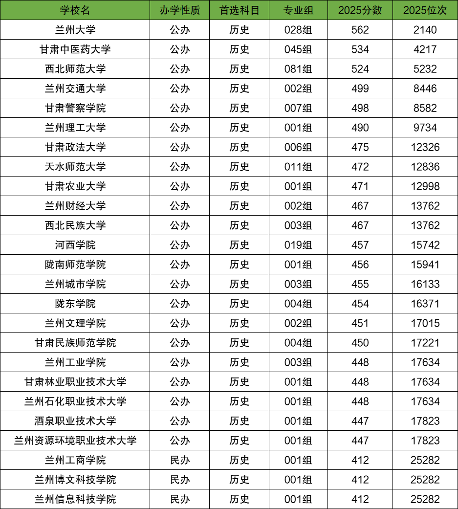 2025年甘肃本科各大学在甘肃历史类最低录取分数线位于412分-562分范围内,位次位于25282名-2140名之间。