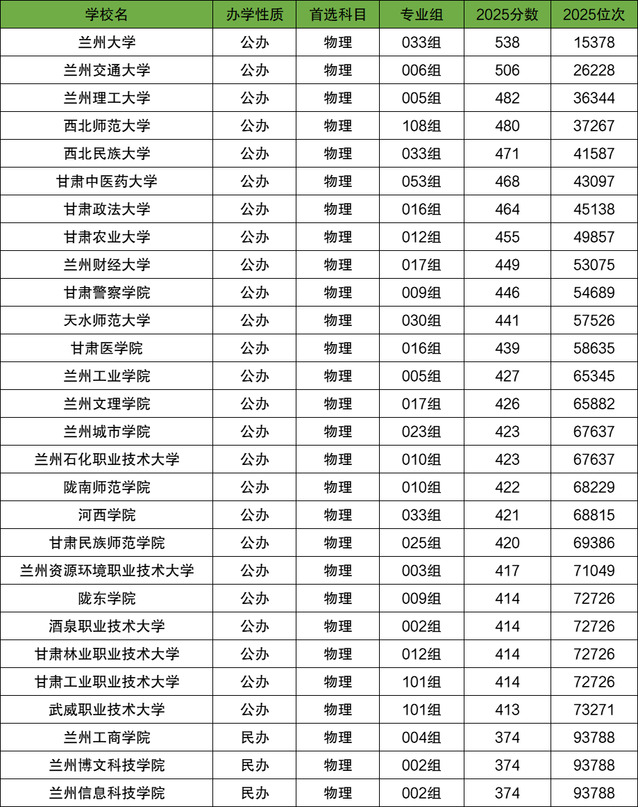 2025年甘肃本科各大学在甘肃物理类最低录取分数线位于374分-538分范围内,位次位于93788名-15378名之间。