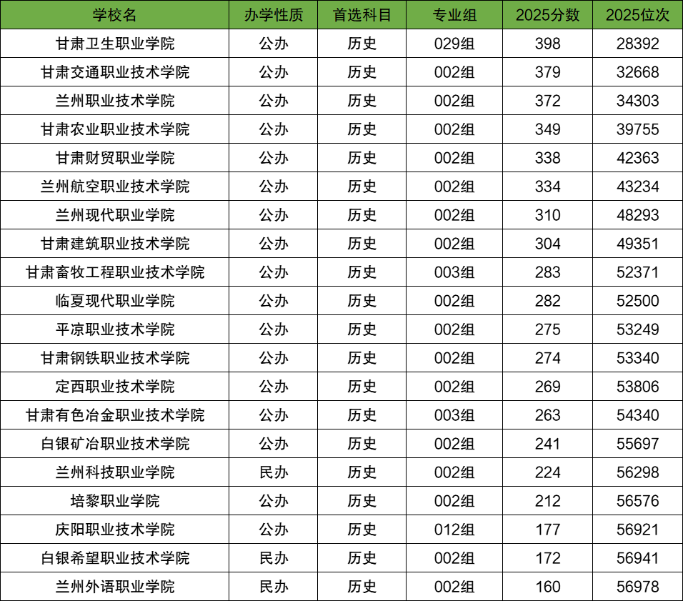 2025年甘肃专科各大学在甘肃历史类最低录取分数线位于160分-398分范围内,位次位于56978名-28392名之间。