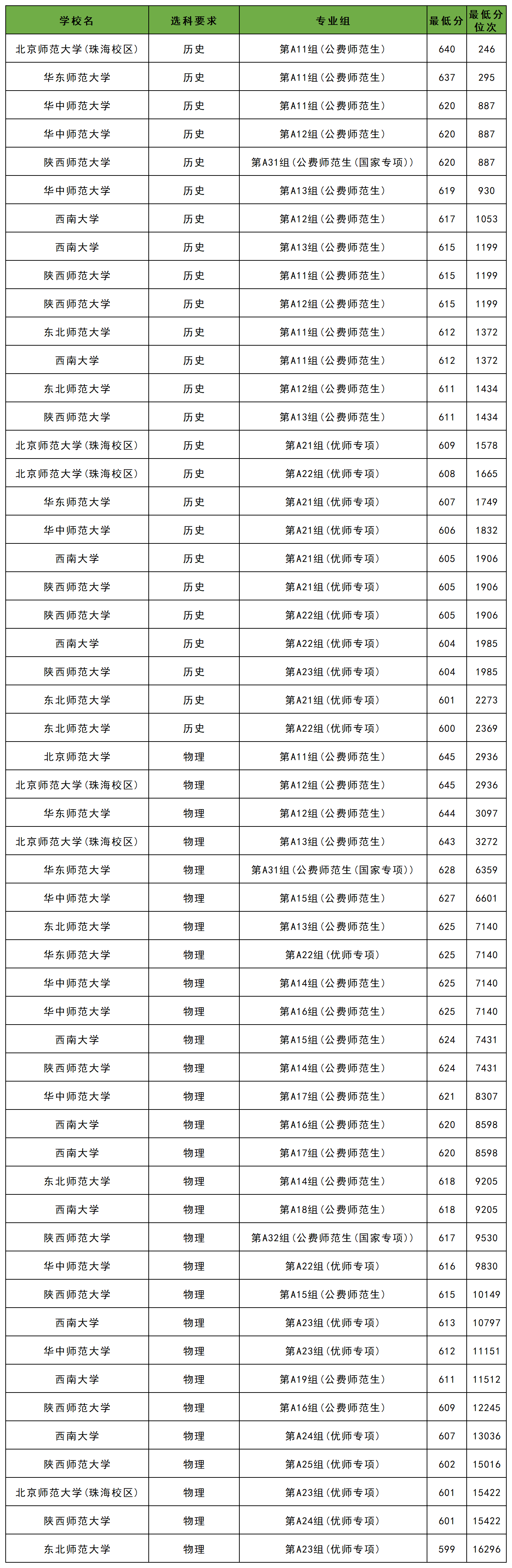 优师计划:历史类最低557分(K44组,定向麻阳苗族自治县),物理类最低537分(K50组,定向麻阳苗族自治县)。