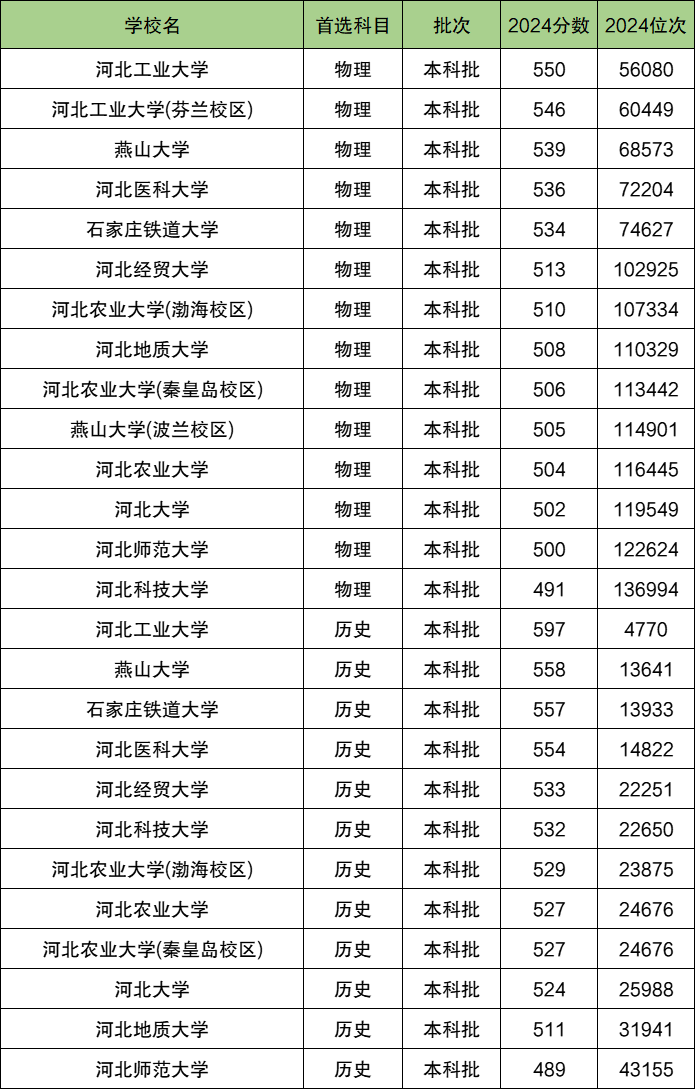 根据河北省2024年高考录取分数线,本文整理出了河北省前十名大学在历史类和物理类的最低录取分数线,以供考生和家长参考。