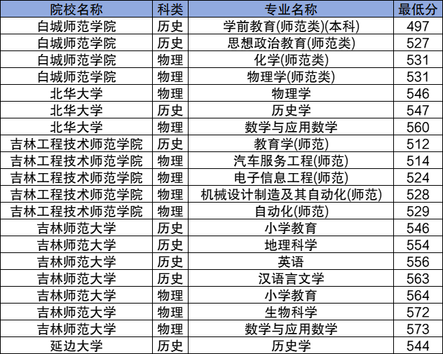 2024年吉林教育考试院公布本科提前批定向招生投档录取分数线,其中包含国家公费师范生和地方公费师范生院校专业组及其最低分,分数详情可见下: