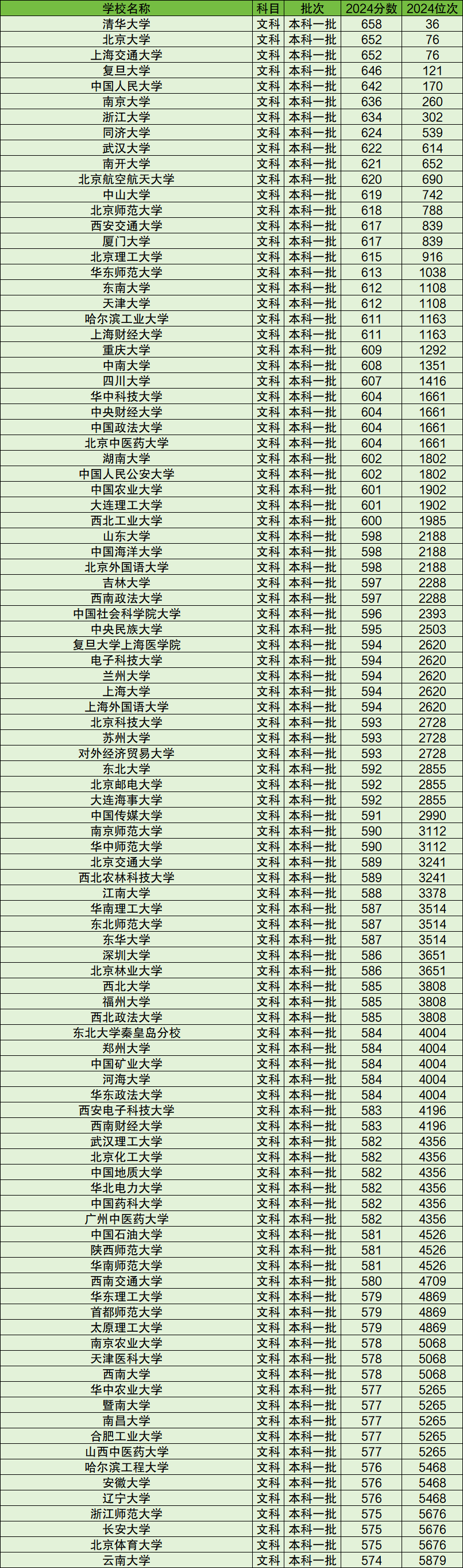 文科一本大学分数线排名前五:清华大学(658分)、北京大学(652分)、上海交通大学(652分)、复旦大学(646分)、中国人民大学(642分)。