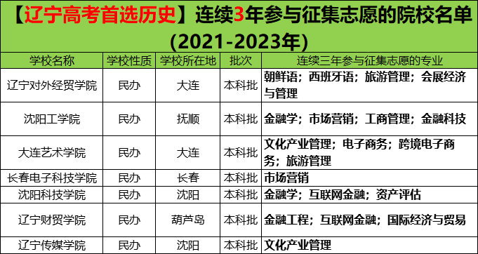 全国连续三年都在辽宁历史科目参与征集志愿的学校共有7所,以下将分别介绍。
