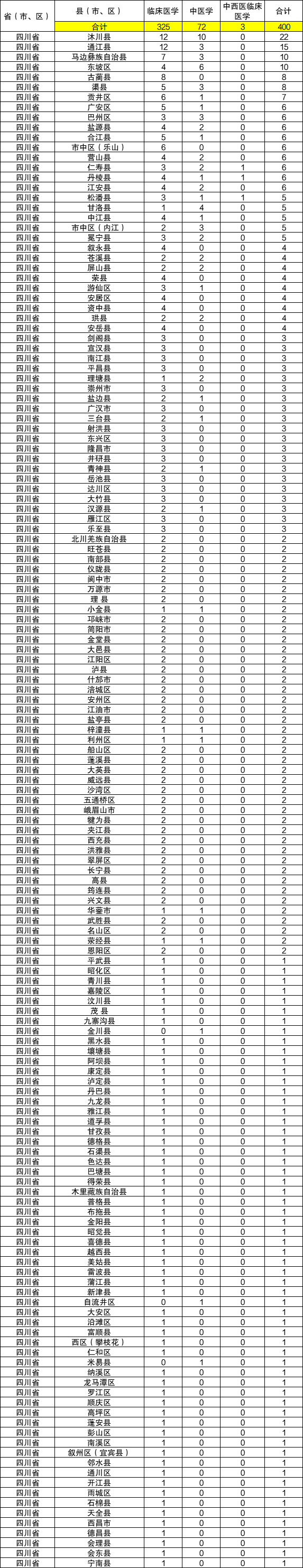 马边彝族自治县:共计10人,其中临床医学7人,中医学3人。