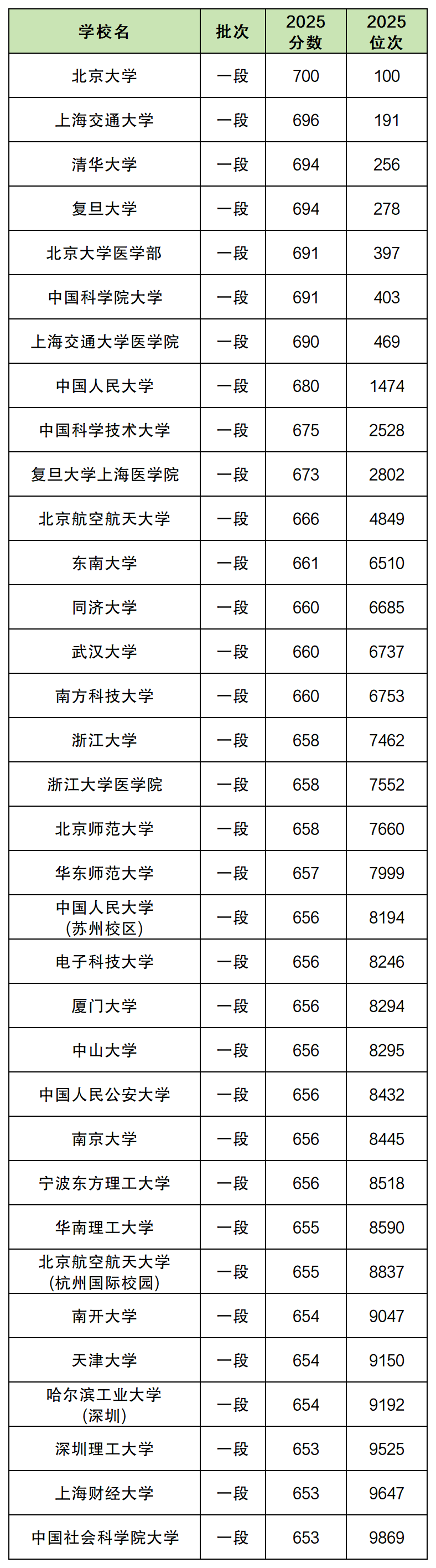 篇幅有限,下面列举2025年在浙江录取位次位于1万名以内的大学及分数线情况,2025年省排名位次在相应录取位次以内的考生可以考虑报考相关院校。