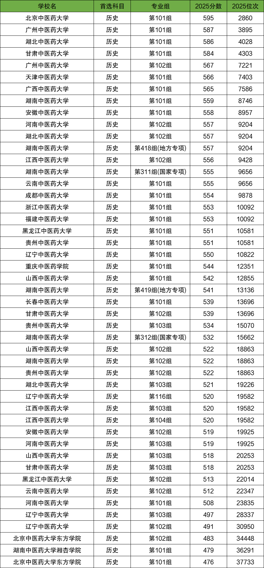 下面是录取分数线最低的历史类中医药大学名单一览表: