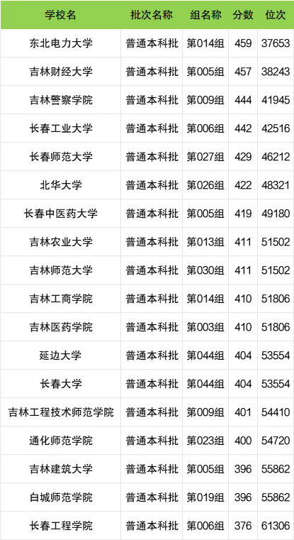 而吉林物理类收分门槛较高、报考难度较大的公办二本有东北电力大学(014组459分)、吉林财经大学(005组457分)、吉林警察学院(009组444分)等。考生至少要超出本科线99分左右报考才有可能被录取。