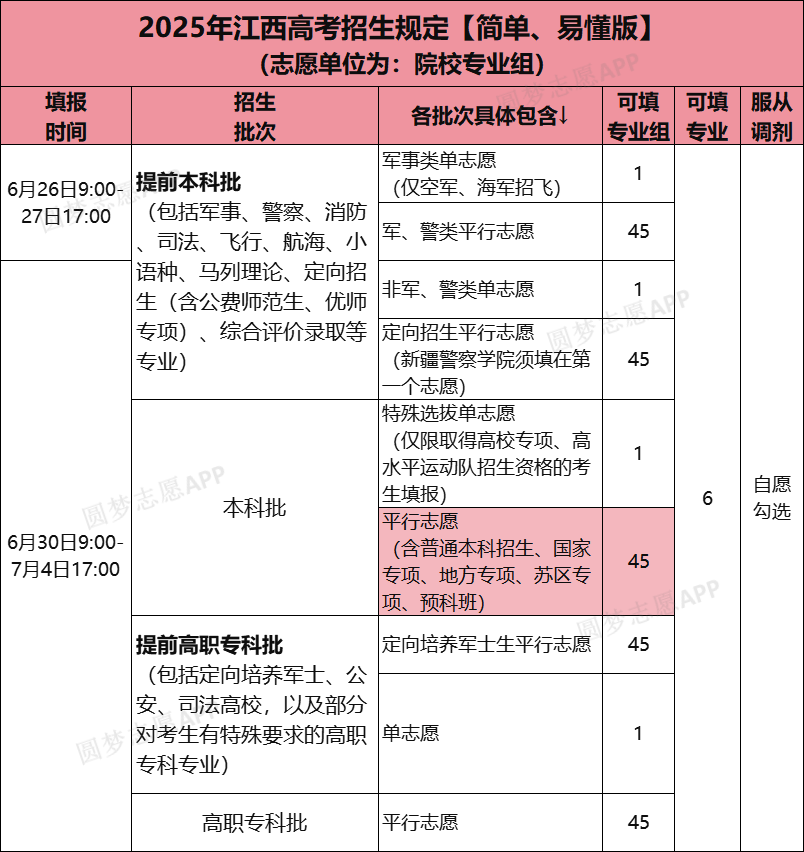 2026年江西新高考志愿填报采用“院校专业组”模式,本科批次设置45个平行志愿,专科批次同样设置45个平行志愿,每个专业组内可选6个专业。这一改革为考生提供了更广阔的选择空间,但也对志愿填报策略提出了更高要求。
