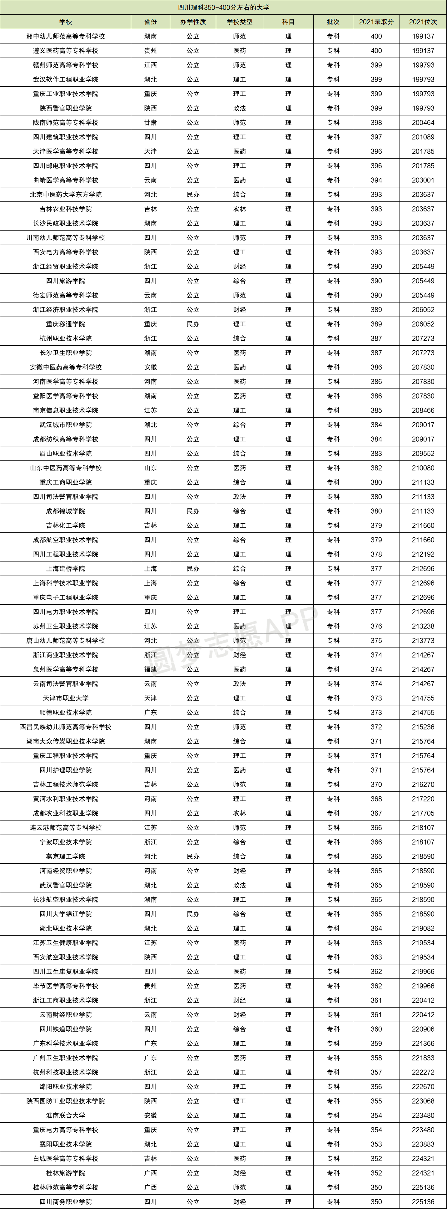 2021年四川理科的二本批次线为430分,所以350-400分是不可能上本科院校的,只能上专科院校。2021年四川理科350-400分的专科院校一共有82所,其中公办院校76所,民办院校6所,这个分数范围内大多都是公办院校,小编也建议大家能不选民办院校就尽量不选民办院校。