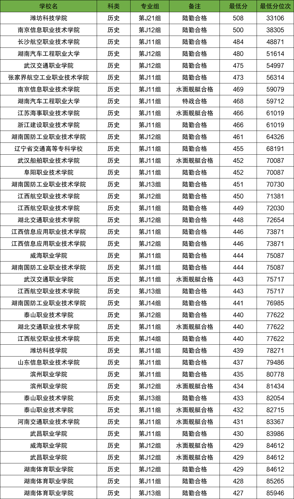 历史类高分段的定向培养士官大学专业组有:潍坊科技学院第J21组、南京信息职业技术学院第J12组、长沙航空职业技术学院第J11组、湖南汽车工程职业大学第J12组等,这些大学专业组2025年高考最低录取分数线均在480分及以上。