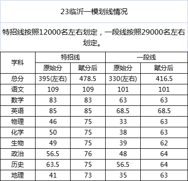 2024年临沂高三第一次模拟考试参考人数约为65200人,据整理统计特招线和一段线以及单科分数线划线情况如下: