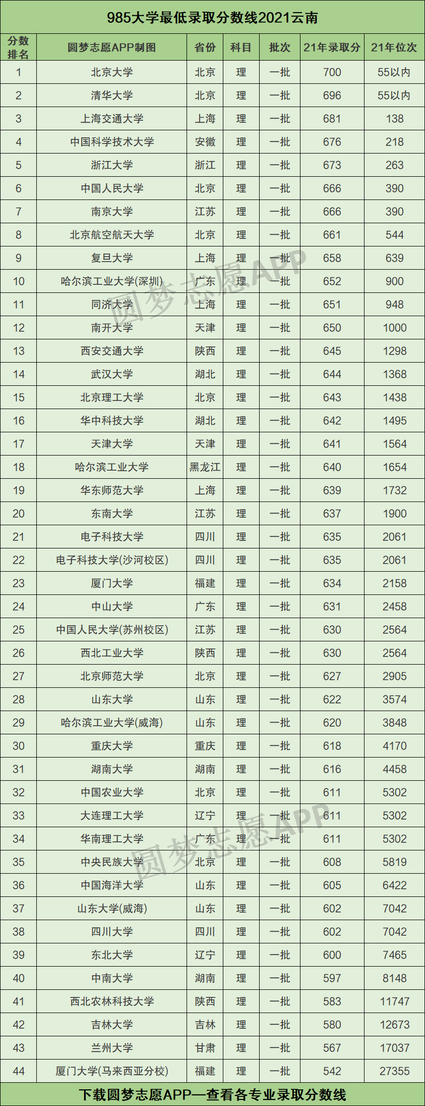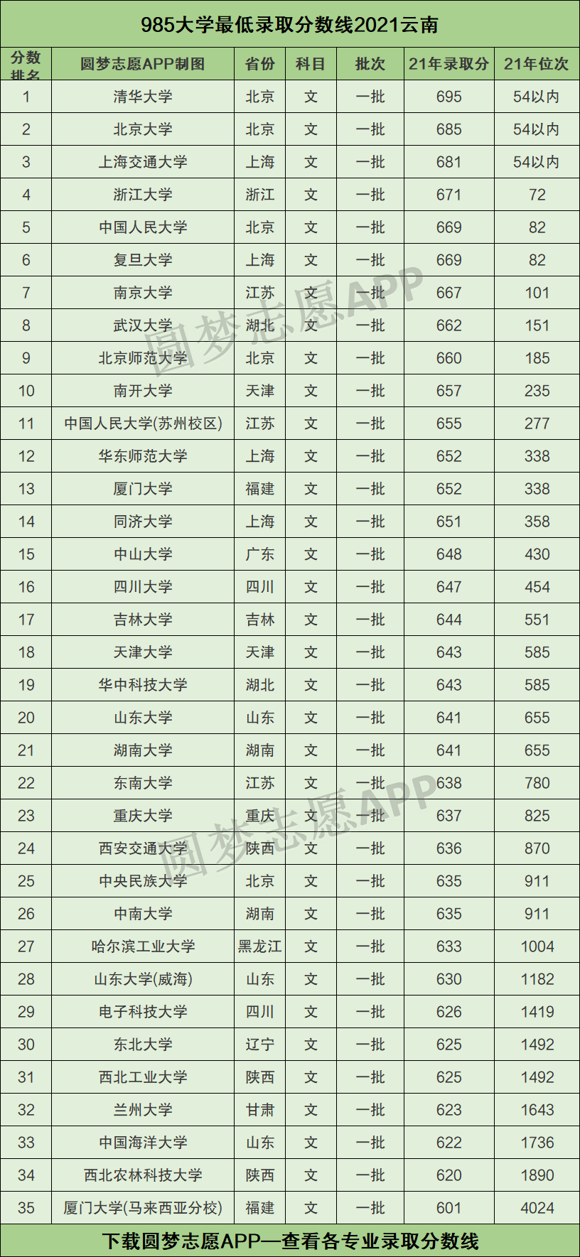 由于本文篇幅有限,将仅为大家展示全国所有的985大学——2021年在云南高考的最低录取成绩。如果你想查看211版的分数线,请直接下载圆梦志愿APP,获取更加详细完整版的全国985 211最低录取成绩(含专业分)。