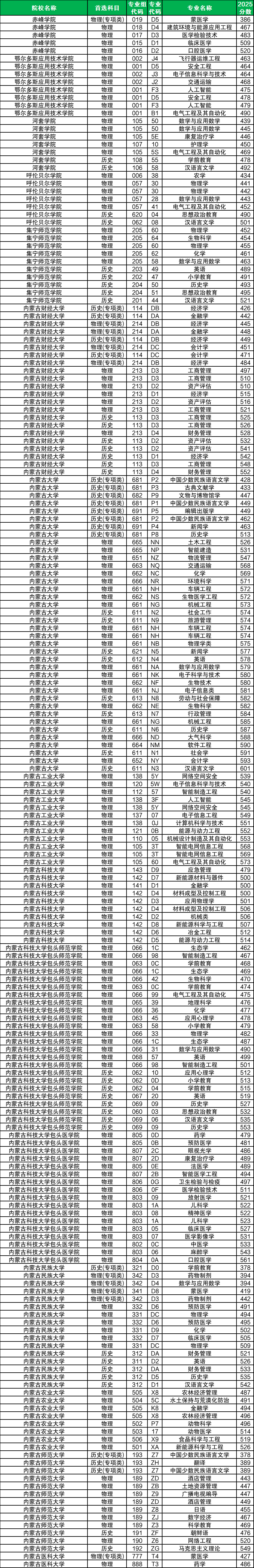 在内蒙古地方专项招生院校有15个,包含81个专业组,其中低分专业组基本为专项类(即原民族语言授课考生报考类):物理类最低386分、历史类最低378分。而普通考生报考的专业组录取最低分为:物理类434分(呼伦贝尔学院006组农学专业)、历史类476分(内蒙古师范大学191组朝鲜语专业)。