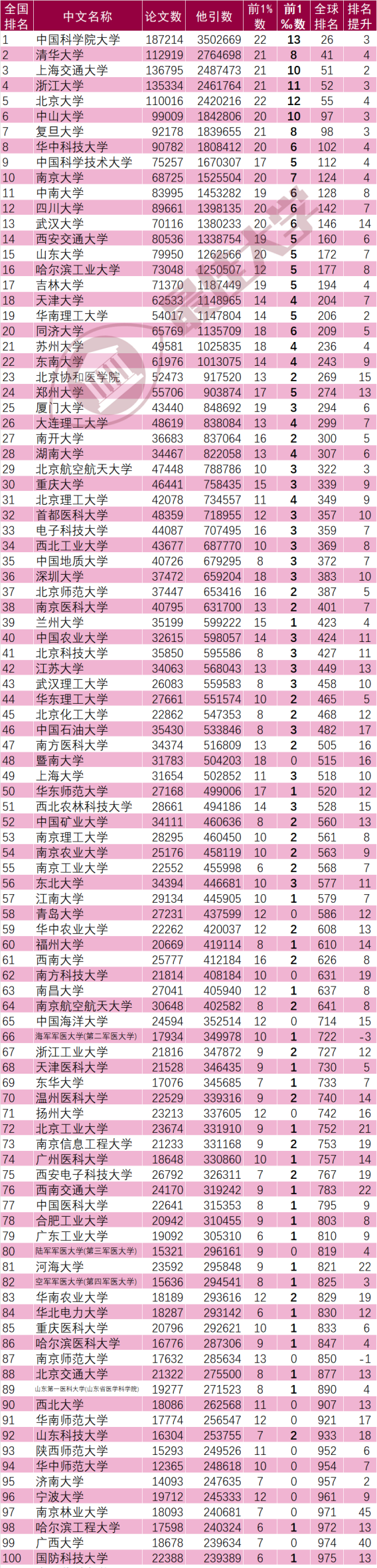 根据2023年ESI公布的全国大学排行榜来看,中国大学排名最新排名前十的大学有:
