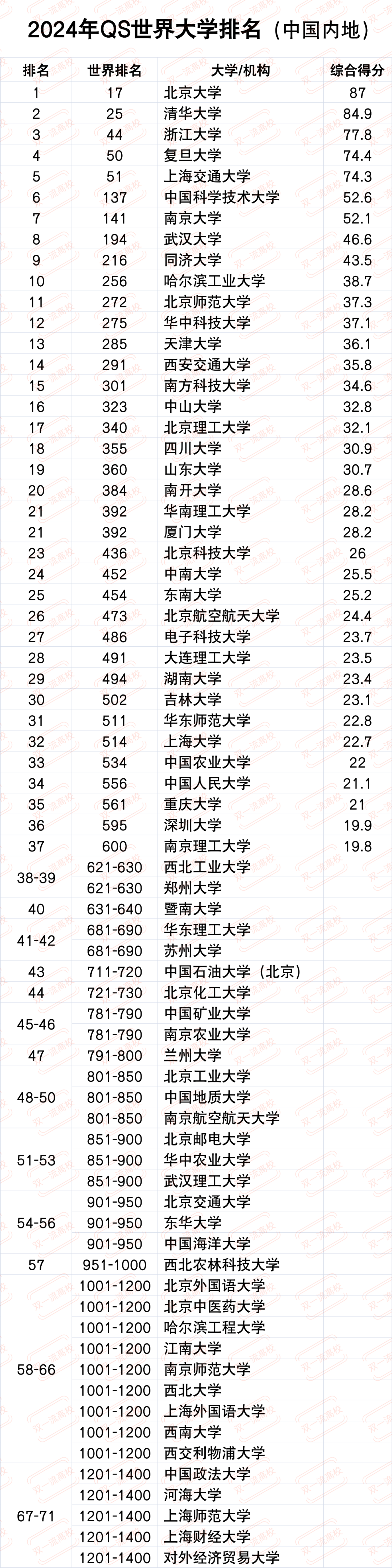2024年QS世界大学排名-中国大学最新排名表如下: