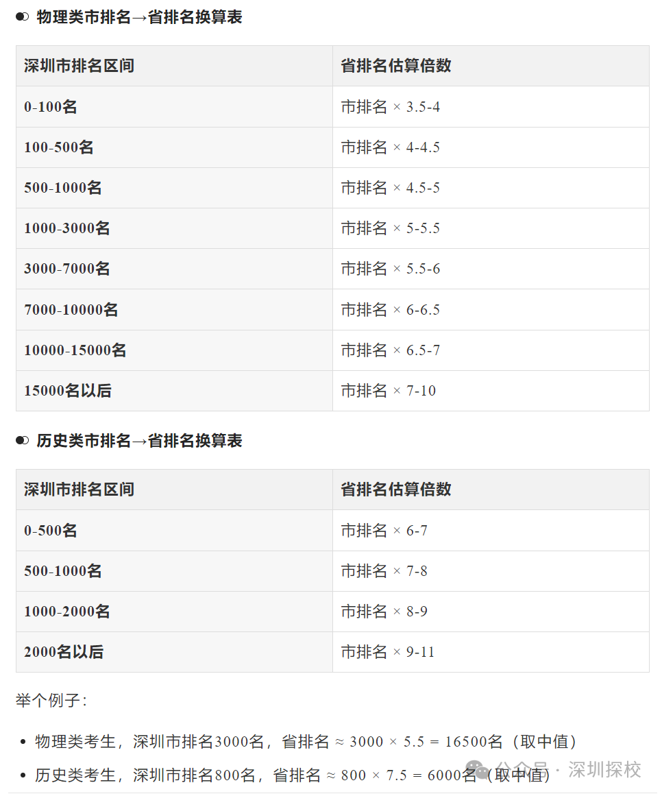 举例:物理类考生深一模市排名2000名,按5倍系数换算,省排名约10000名;历史类考生市排名800名,按7—8倍换算,省排名约5600—6400名。