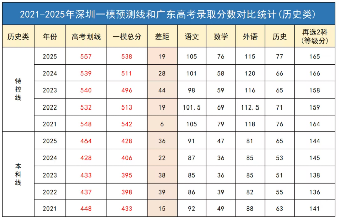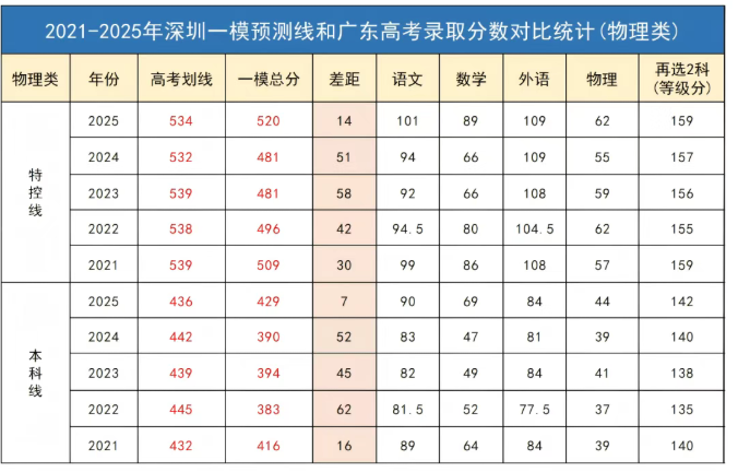 下面是近五年深圳一模划线与广东高考录取分数线对比,各位考生可参考预估2026年高考录取分数线: