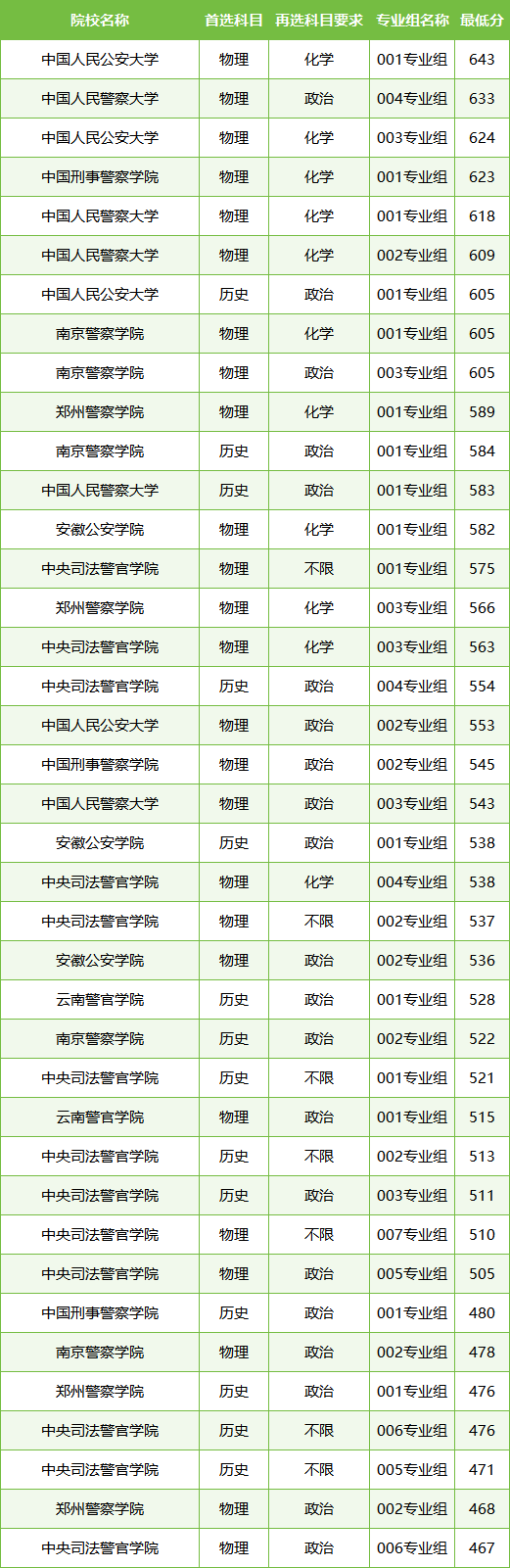 中国人民警察大学应该属于报考热度最高的院校之一,院校实力本身也很强,在分数排名前十五的专业组中,该校就有4个。该校最低分专业组是003专业组,分数是543分。