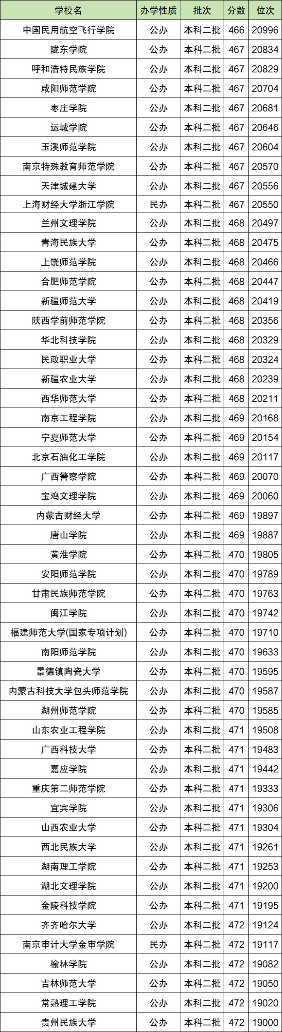 2万名左右最高位次对应的院校是贵州民族大学,最低录取位次为19000位,位次对应分数为472分;