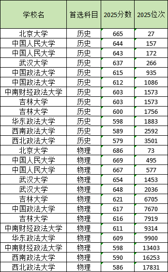 录取分数线最低的是西北政法大学,2025年最低分579分(位次3501名),超本科线129分。
