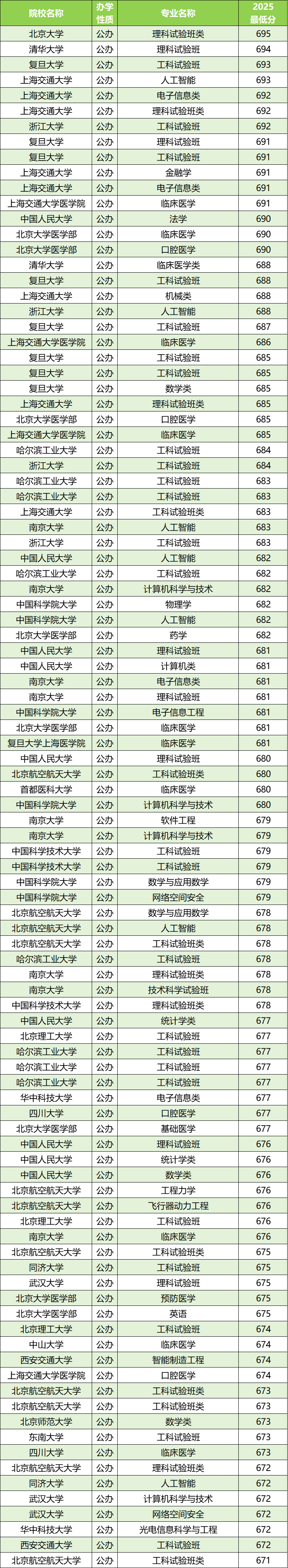 除此之外,分数线在685分及以上的还有清华大学(理科试验班694分)、复旦大学(工科试验班693分)、上海交通大学(人工智能693分)、浙江大学(工科试验班692分)等,均为尖子生的热门选择。