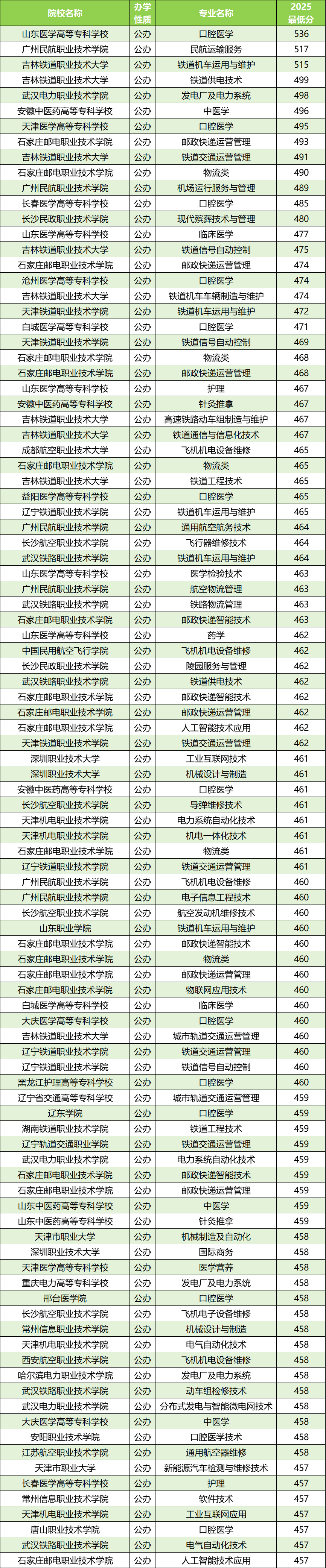 除此之外,分数线480分及以上的还有广州民航职业技术学院(民航运输服务517分)、吉林铁道职业技术大学(民航运输服务517分)、武汉电力职业技术学院(发电厂及电力系统498分)等,这些均为专科批竞争强度较大的院校专业。