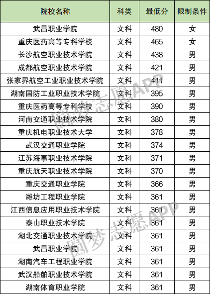 在女生方面,共有两所院校面向女生招生,包含武昌职业学院(480分)、重庆医药高等专科学校(465分)。