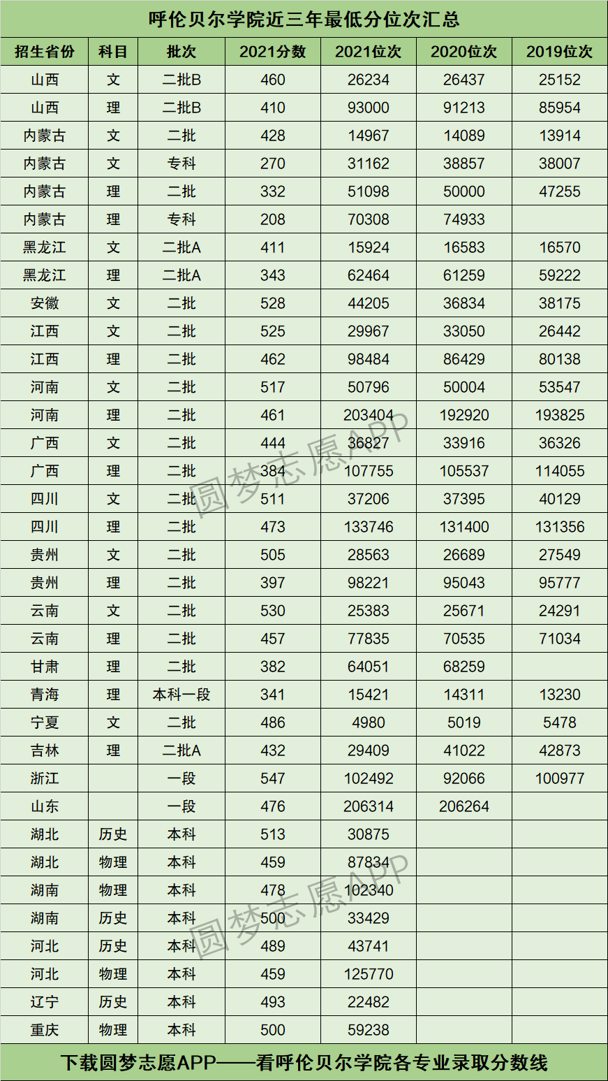 下图为呼伦贝尔学院在全国各个省市2019年~2021年的最低分位次表数据,供参考↓