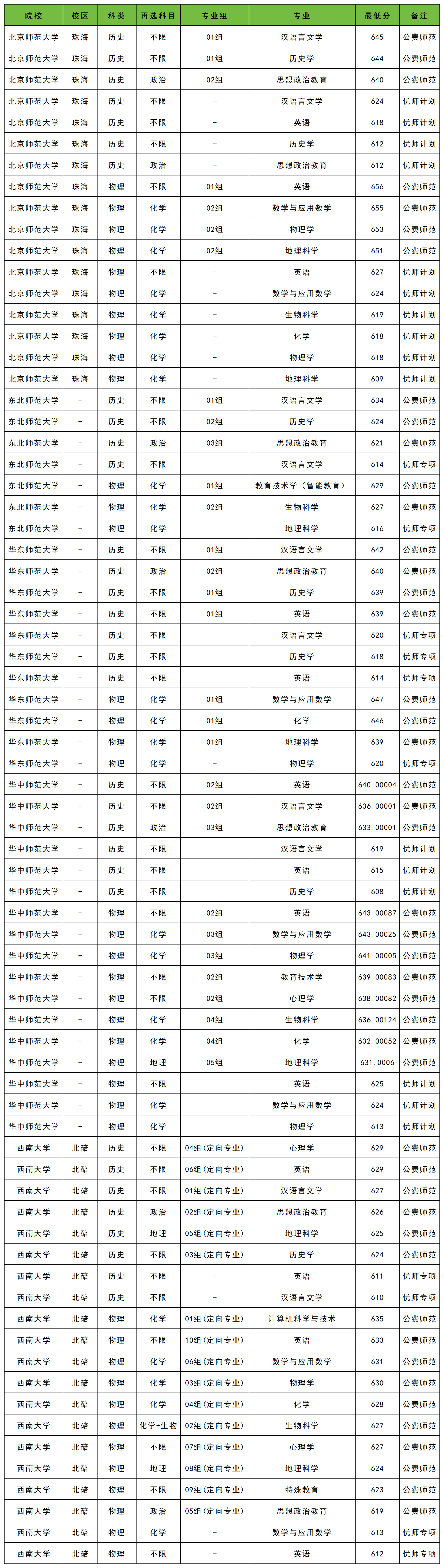 优师专项:历史类最低608分(历史学),物理类最低613分(物理学)。