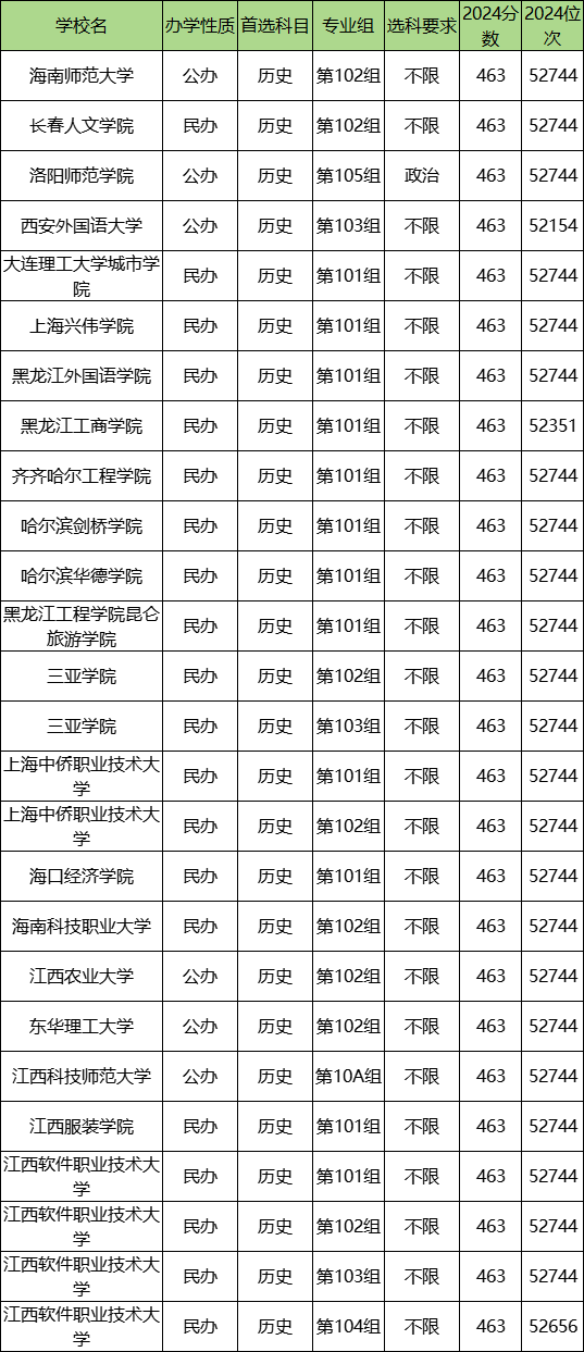 2025年能够选科的地区都不分一本二本,考生们只能知道多少分可以考二本大学,而且各省的录取数据还不一样,以江西2024年数据为例,历政生最低463分可以考上本科大学,对应的大学有海南师范大学、长春人文学院等。