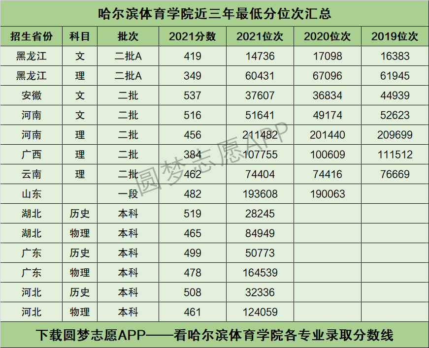 根据圆梦志愿APP提供的数据,哈尔滨体育学院2021年在黑龙江省本科二批文科考生中录取的最低分为419分、最低分位次为14736名;在理科考生中录取的最低分为349分、最低分位次为60431名。