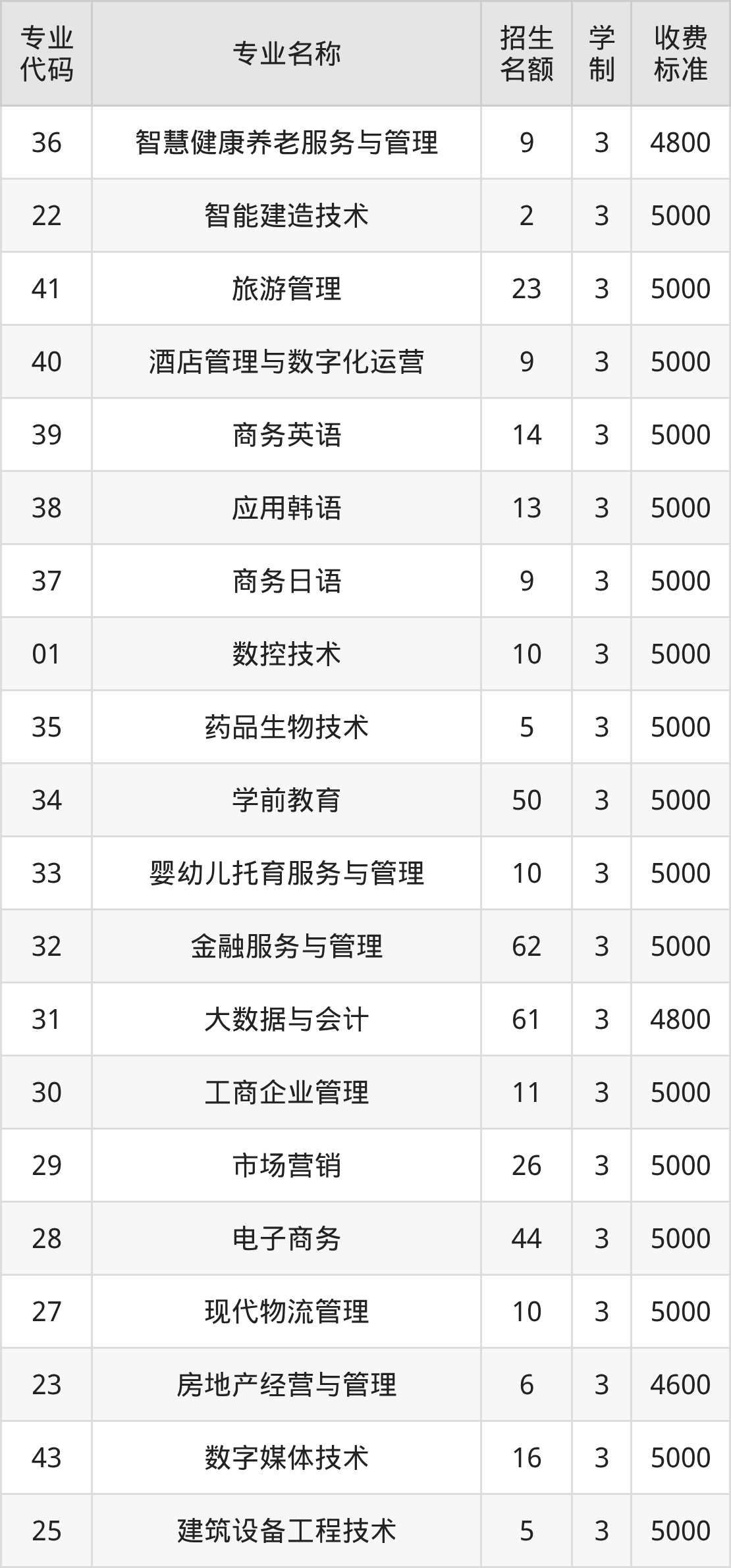 | 专业 代码 | 专业名称 | 招生 名额 | 学 制 | 收费 标准 |