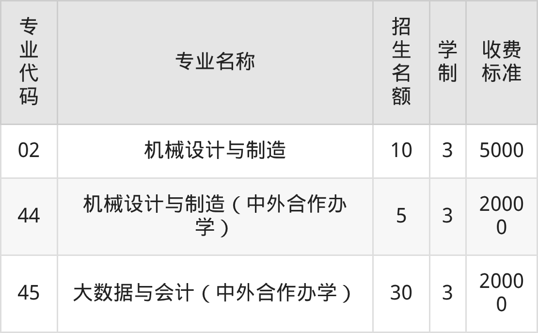 | 44 | 机械设计与制造(中外合作办学) | 30 | 3 | 20000 |