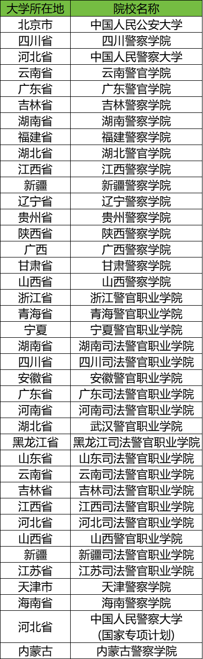 河北(3所):中国人民警察大学、河北司法警官职业学院、中国人民警察大学(国家专项计划);