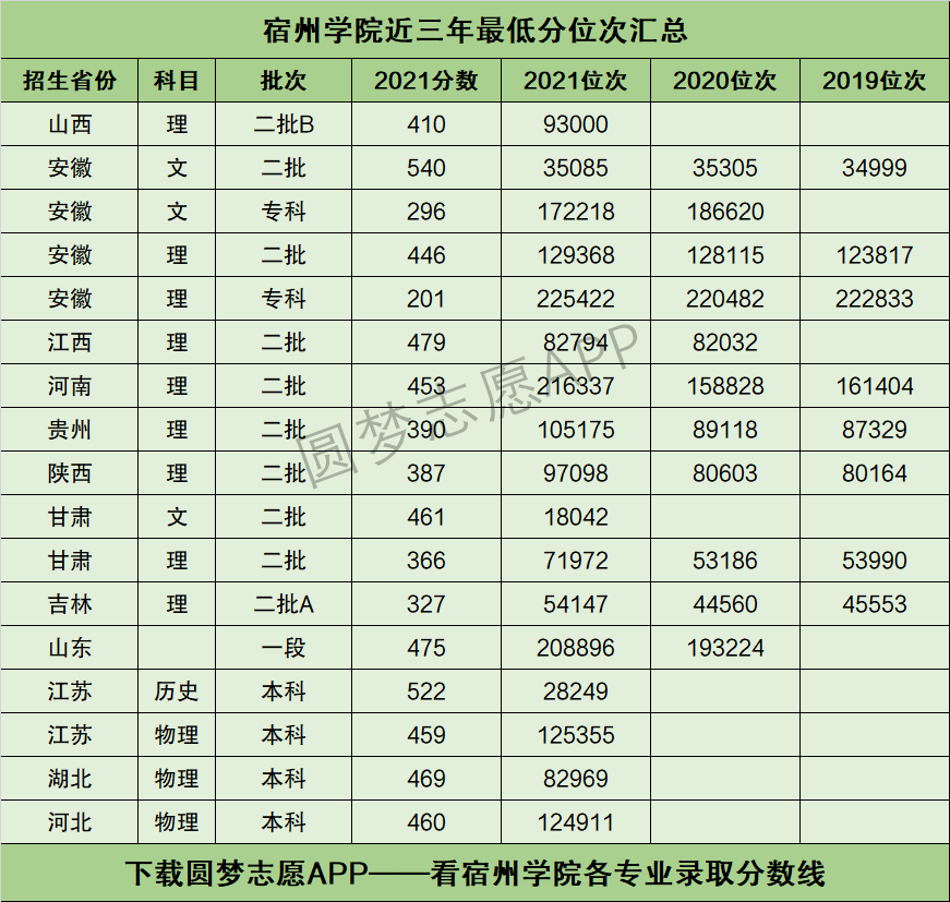 下图为宿州学院在全国各个省市2019年~2021年的最低分位次表数据,供参考↓