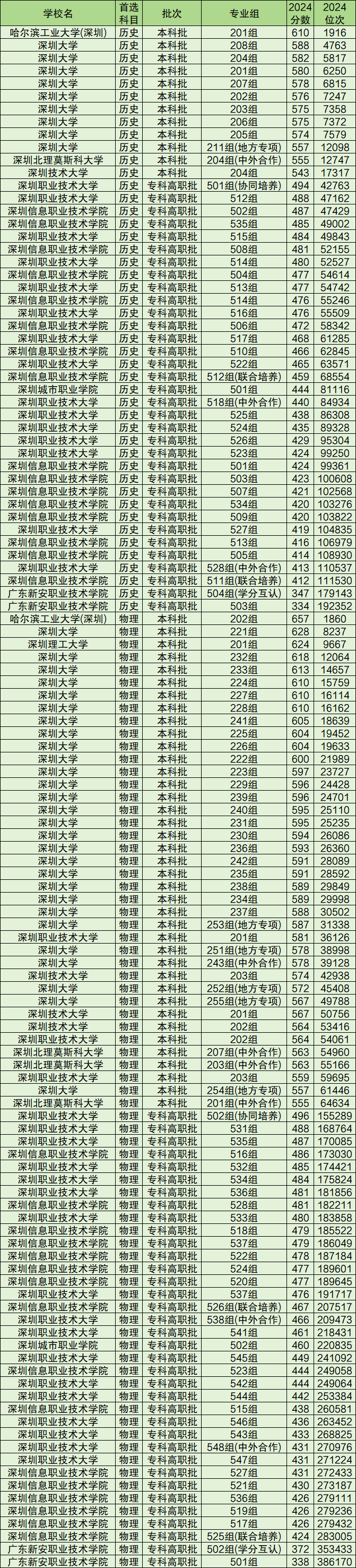 2024年广东省高考录取中,首选历史收分最高的大学是哈尔滨工业大学(深圳)(201组),2024年分数线610分;收分最低的大学是广东新安职业技术学院(503组),2024年分数线为334分。