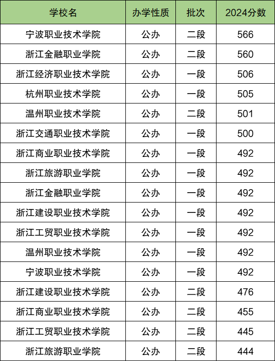 2024年浙江十大专科院校招生分数线范围在444分~566分之间,考生至少要超二段线(269分)175分以上才能报考。