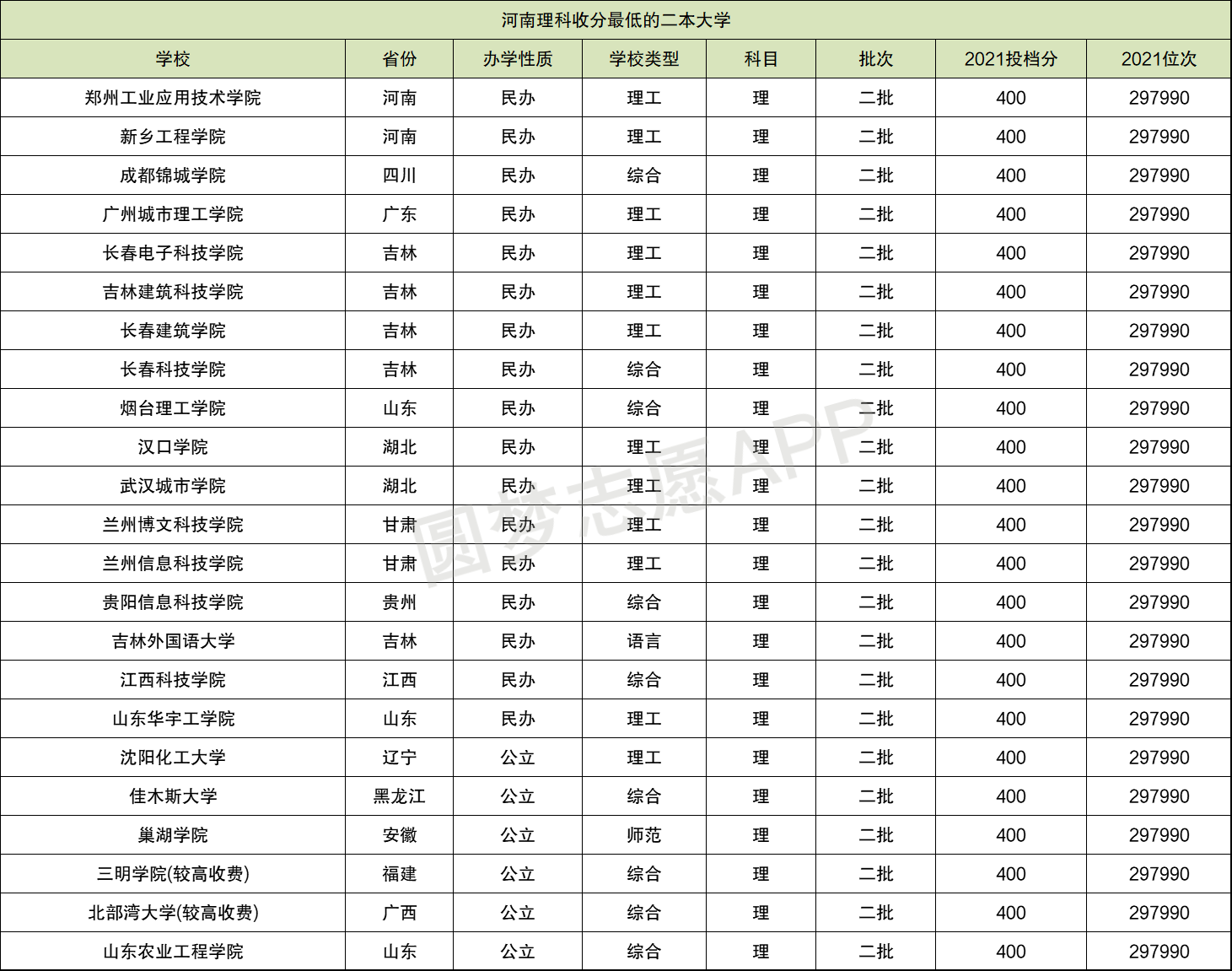 2021年河南理科的二本批次线为400分,而最低分数线400分的院校一共有23所,其中公办院校有6所,民办院校有17所,小编依然要提醒大家,要按照近三年的录取情况来选择报考的院校,不要盲目报考。