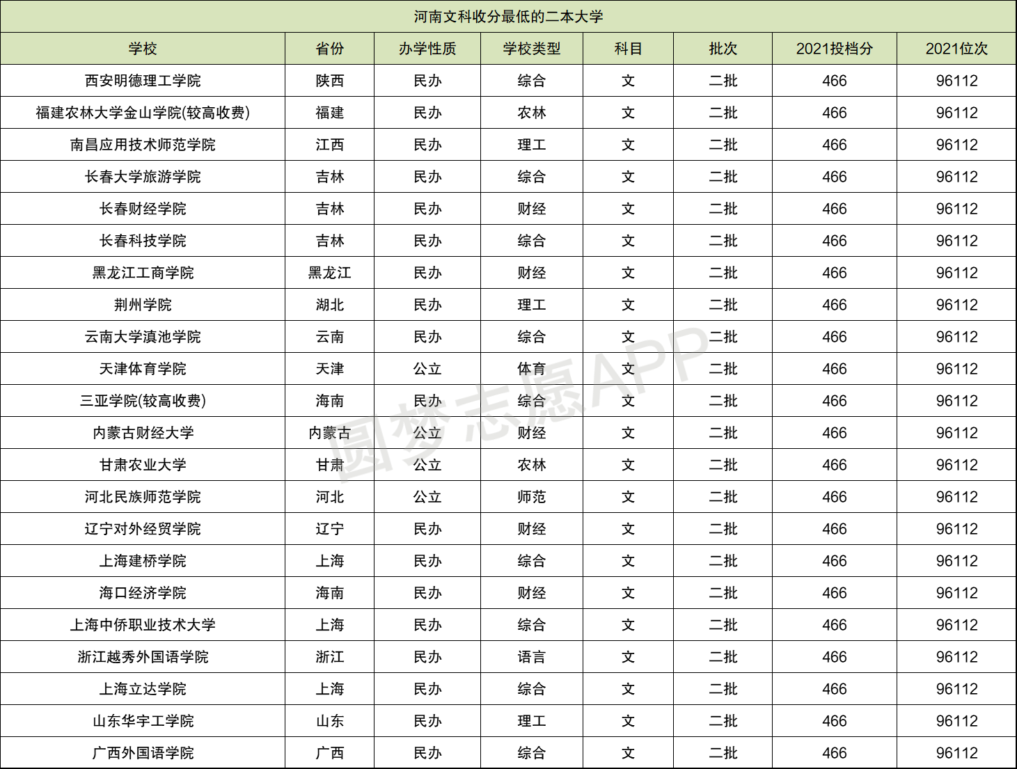 2021年河南文科收分最低的公办本科大学是河北民族师范学院、甘肃农业大学、内蒙古财经大学、天津体育学院,2021年的分数线为466分,位次为96112位,这四所院校在2021年的分数线都是正好在河南文科的二本批次线上,擦线的考生可以考虑这四所院校。