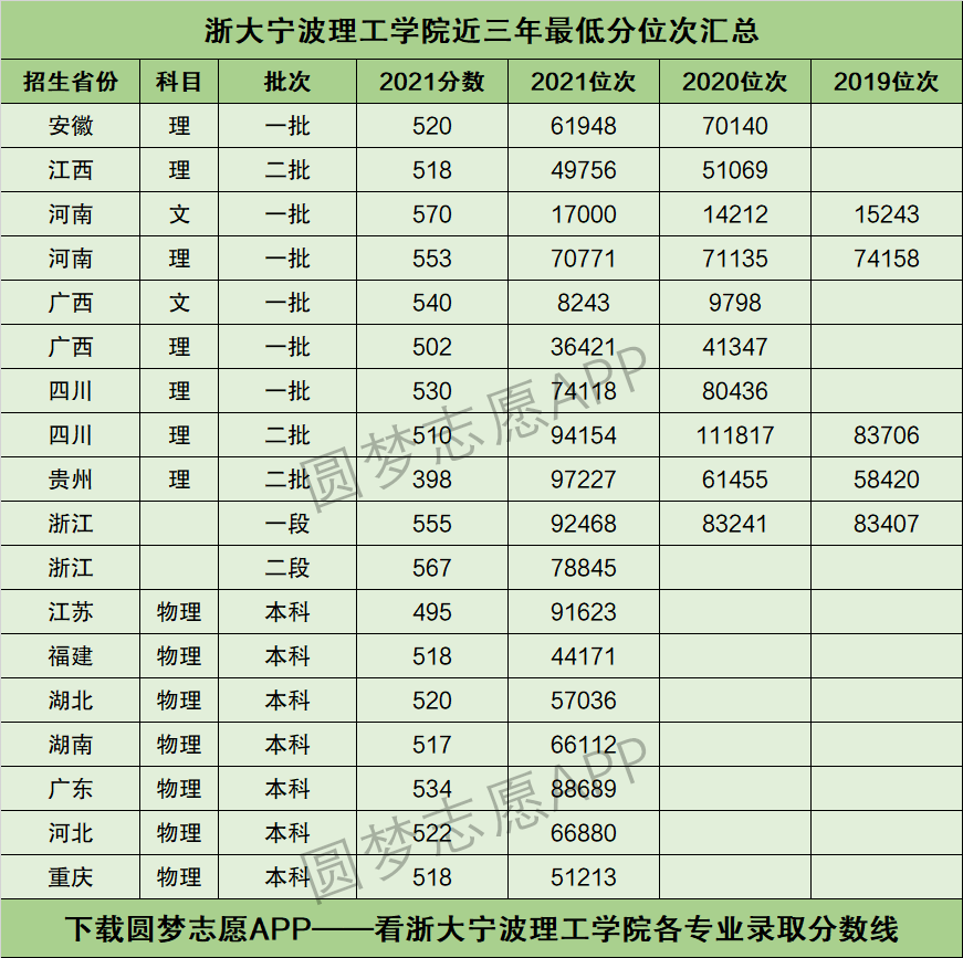 下图为浙大宁波理工学院在全国各个省市2019年~2021年的最低分位次表数据,供参考↓