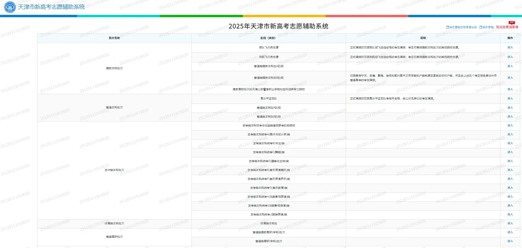 提前本科批次:涵盖军事、公安、公费师范生、飞行员院校等特殊类型招生。其中,军队招收飞行员院校实行顺序志愿,设置1个院校专业组志愿;民航招收飞行员院校实行平行志愿,设置2个院校专业组志愿;其他院校实行顺序志愿,设置1个院校专业组志愿。每个院校专业组志愿栏中设置6个专业志愿和1个服从调剂专业志愿。