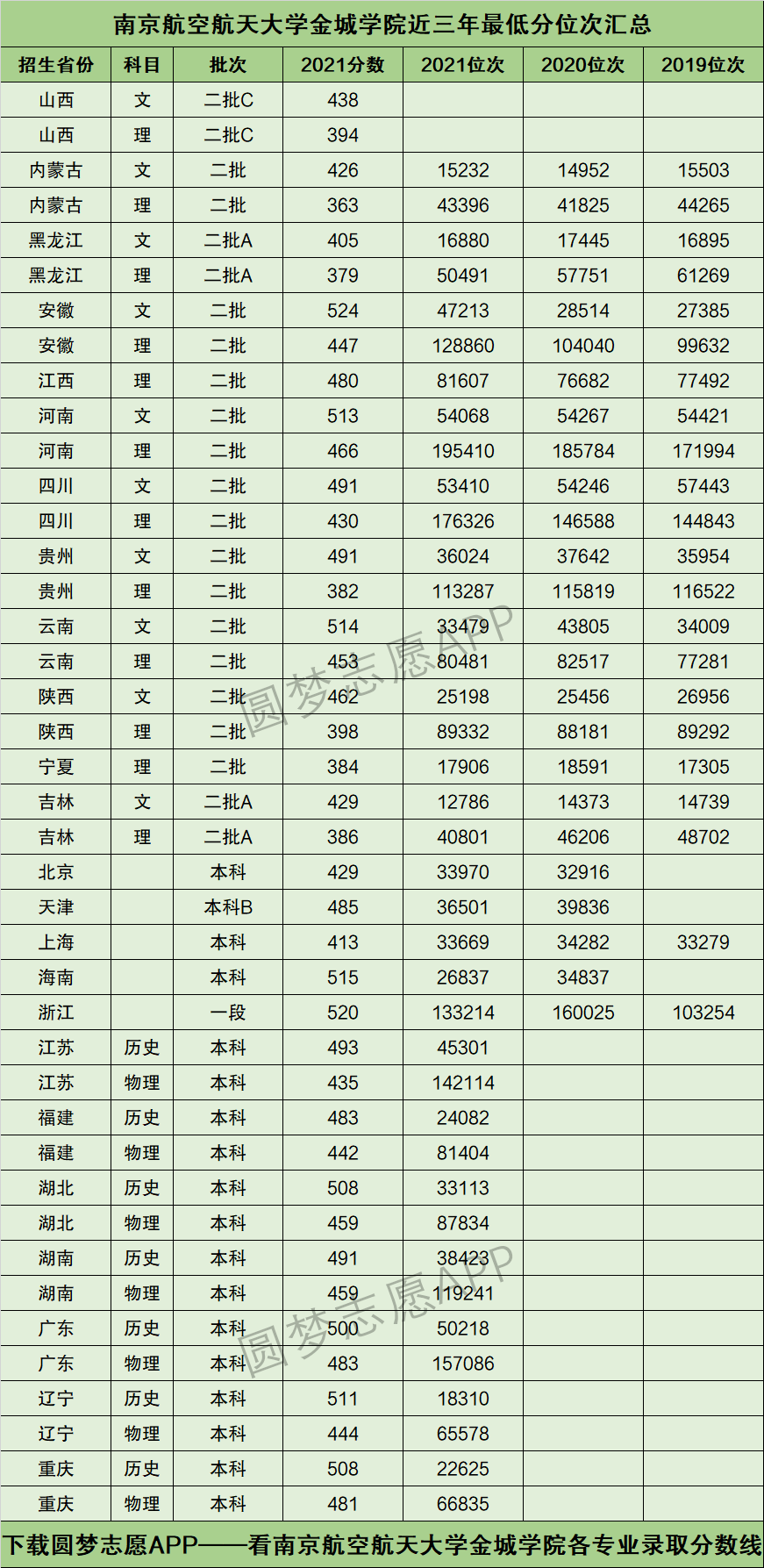 下图为南京航空航天大学金城学院在全国各个省市2019年~2021年的最低分位次表数据,供参考↓