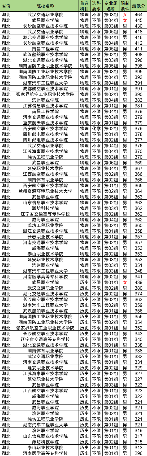 武汉交通职业学院:物理类女464分、男376分;历史类332分;