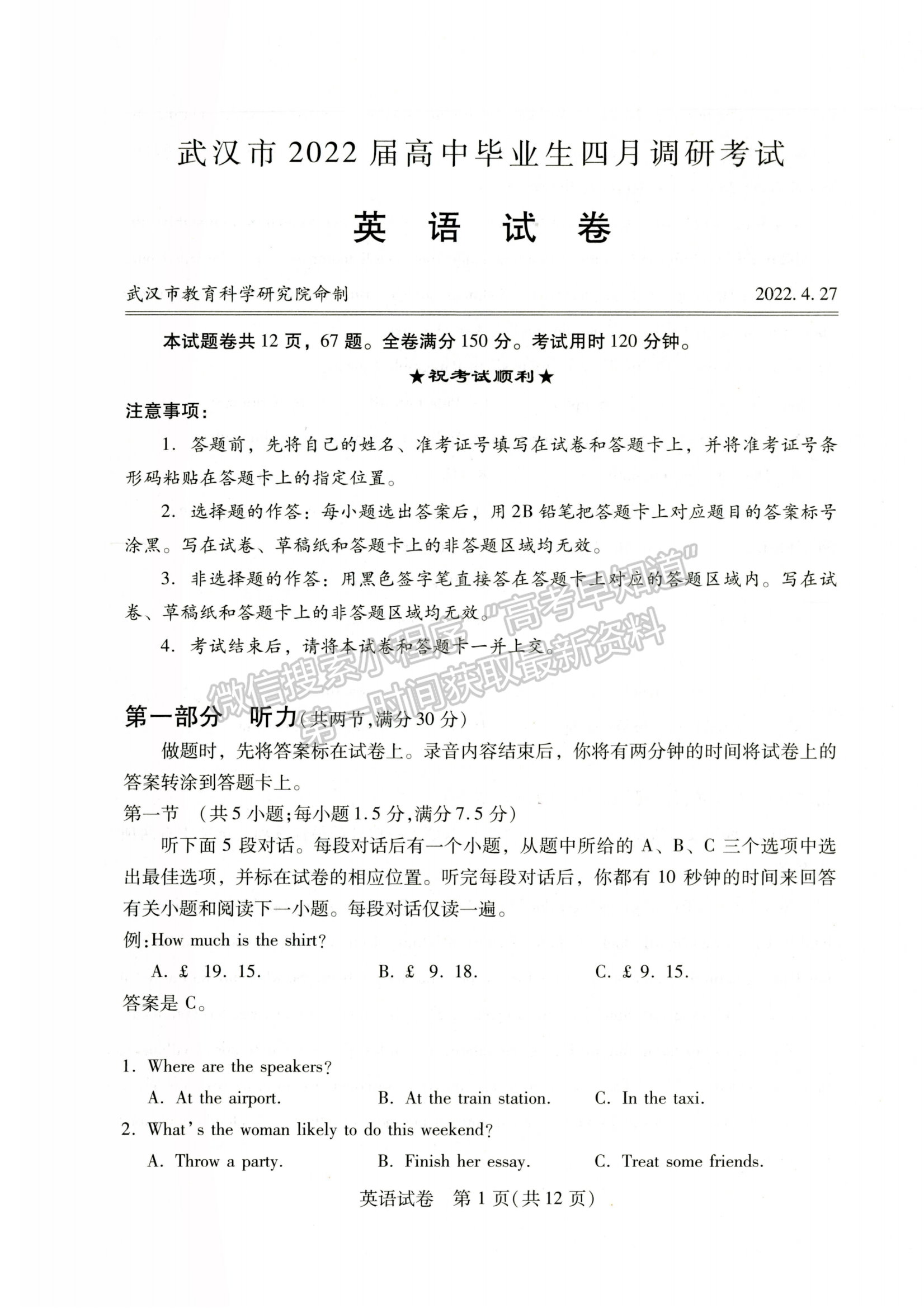 关于2022年武汉高三四调英语试卷答案,本文将在考试结束后尽快更新。