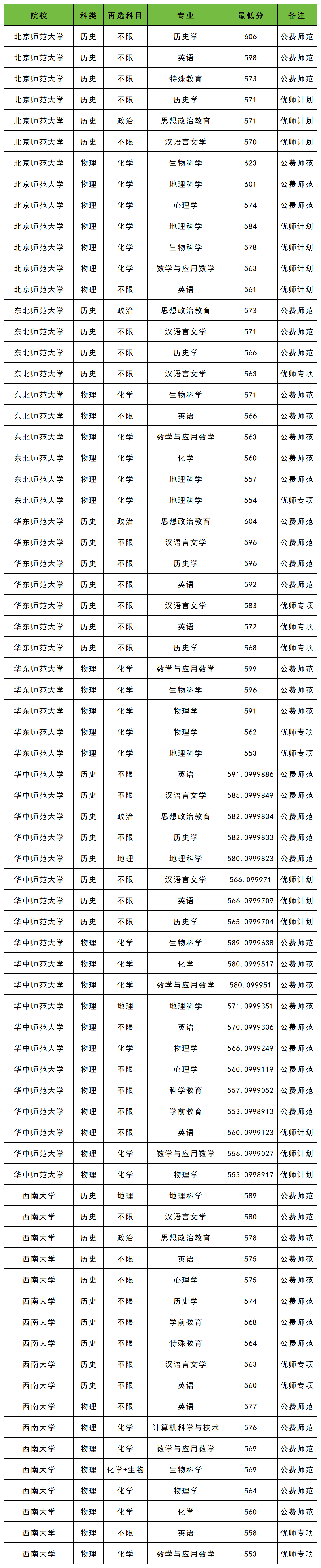 优师专项计划:2025年历史类类最低分564分,物理类最低分553分。
