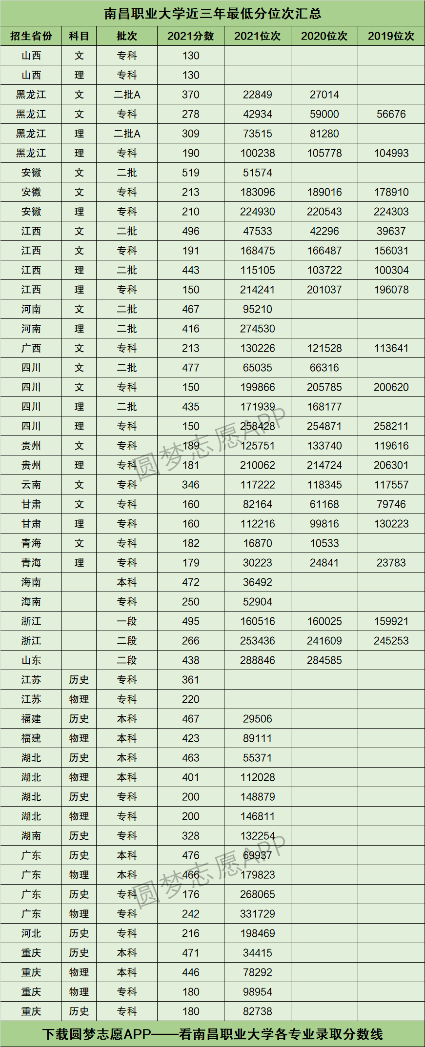 根据圆梦志愿APP提供的数据,南昌职业大学2021年在江西省本科二批文科考生中录取的最低分为496分、最低分位次为47533名;在理科考生中录取的最低分为443分、最低分位次为115105名。
