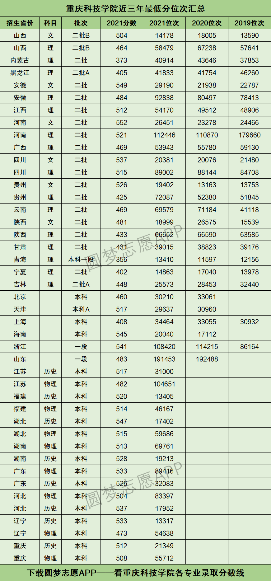 下图为重庆科技学院在全国各个省市2019年~2021年的最低分位次表数据,供参考↓