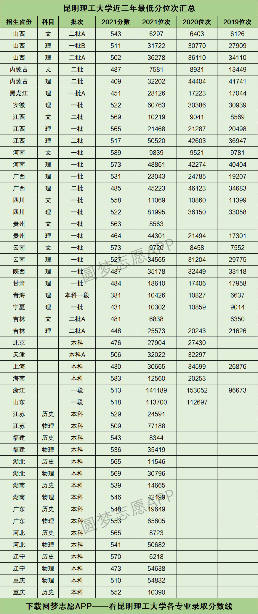 下图为昆明理工大学在全国各个省市2019年~2021年的最低分位次表数据,供参考↓