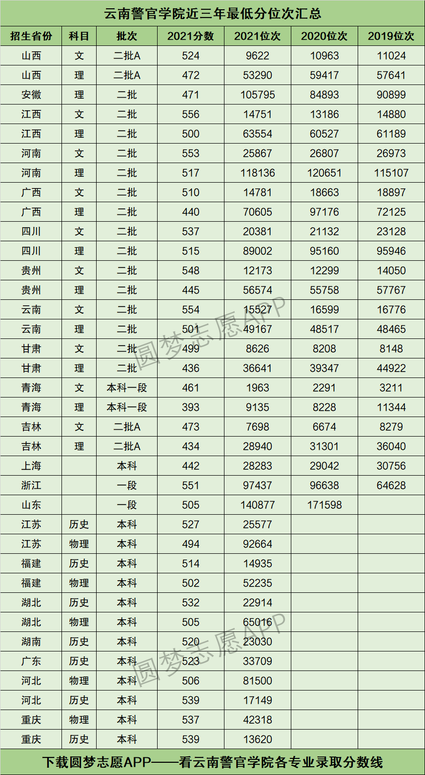 下图为云南警官学院在全国各个省市2019年~2021年的最低分位次表数据,供参考↓